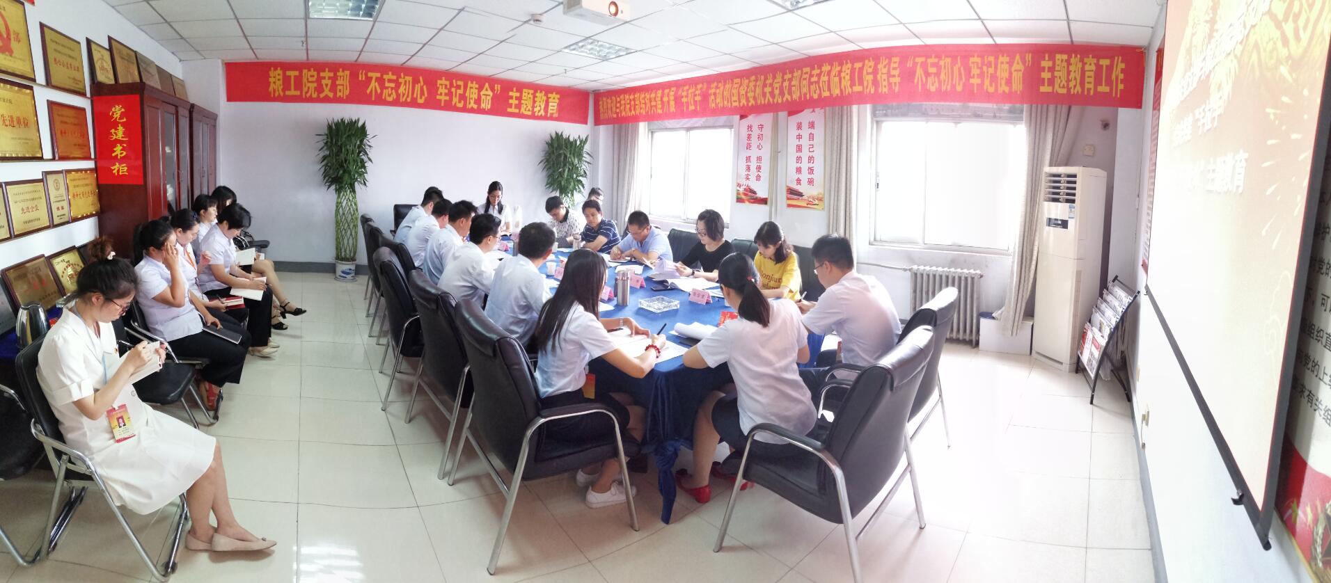 粮工院支部书记梅海宇就院基本情况、“不忘初心、牢记使命”主题教育、党建工作、廉政建设、生产经营、问题与不足等方面作了详细汇报。